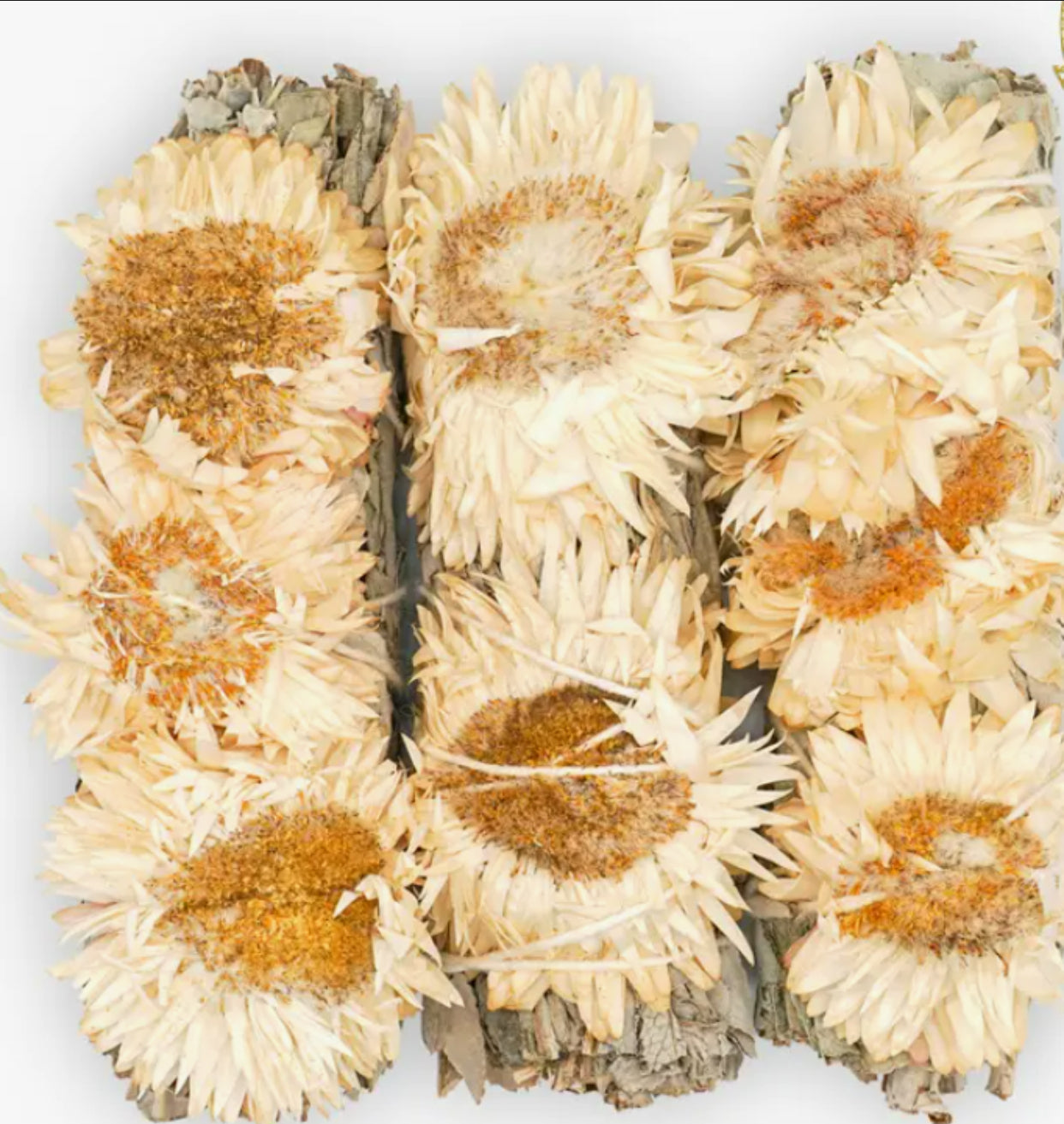 Natural flowers are placed on sage bundles, bundles may have slight variation in color.