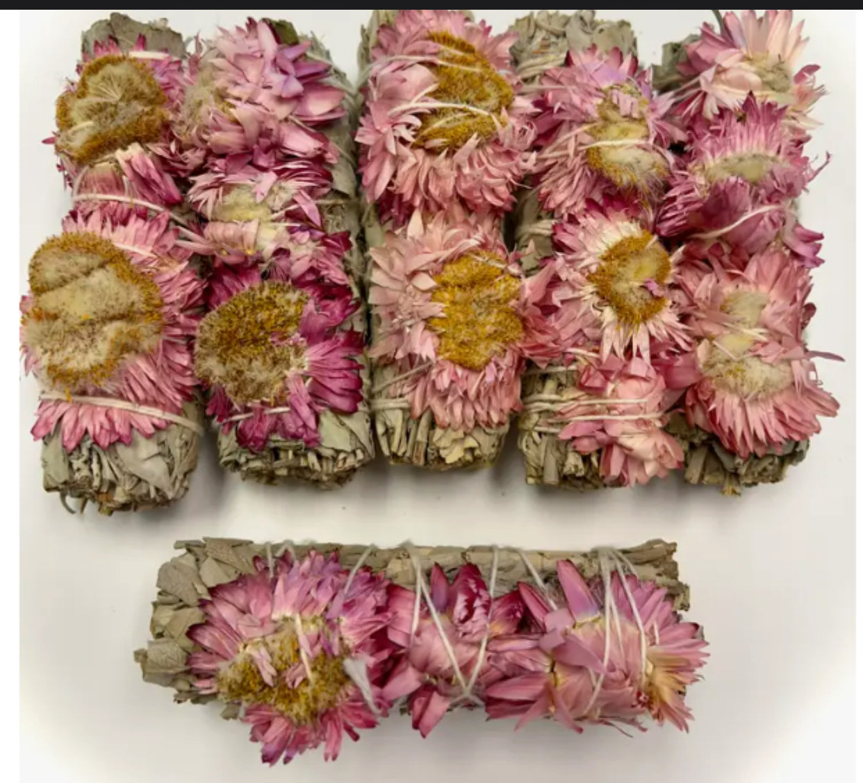 Natural flowers are placed on sage bundles, bundles may have variation in flower size and in color from pale pink to fuchsia depending on the harvest.