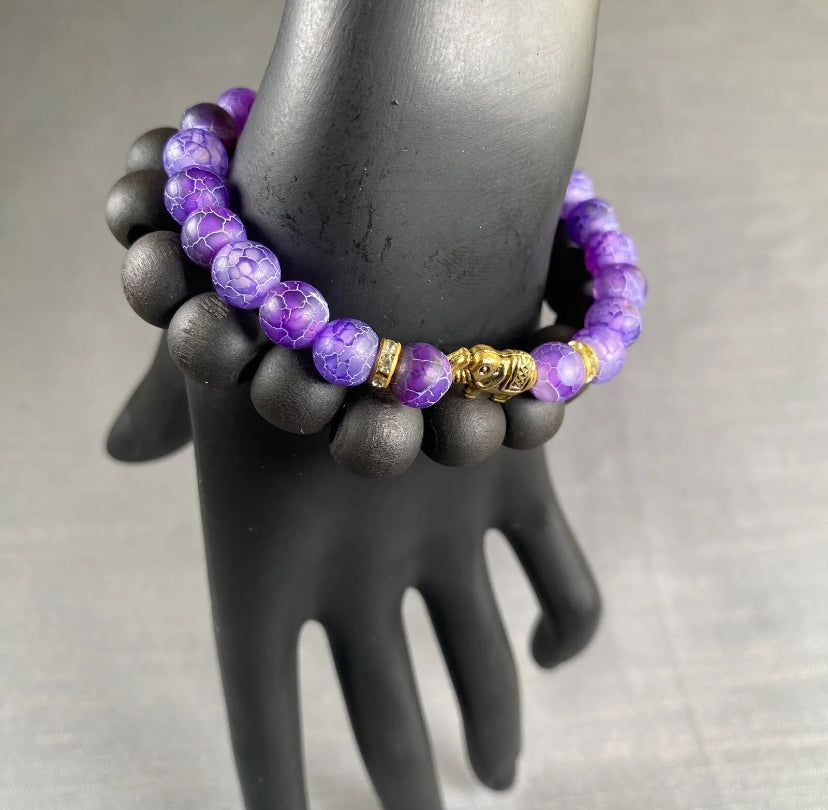 Elevate your fashion game with this exquisite 2-piece set of Purple Stone Gold Elephant Charm Black Wooden Bead Bracelets. The bracelets are perfect for both men and women and have a unique design that is inspired by nature. The bracelets are made of high-quality materials, including natural stones, and have an attractive beaded style.
